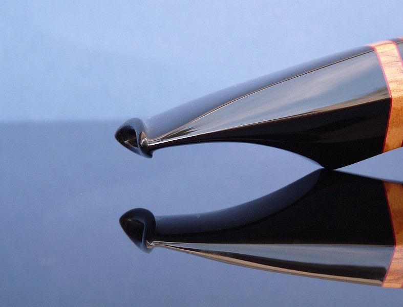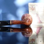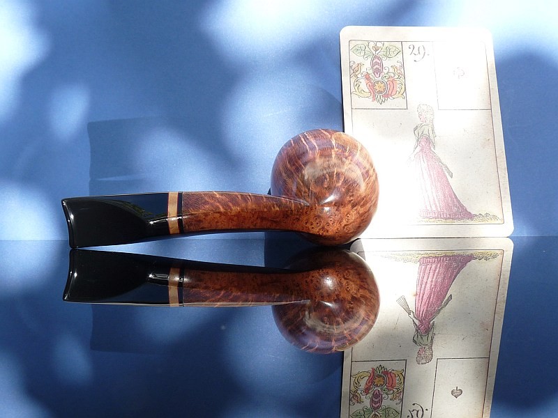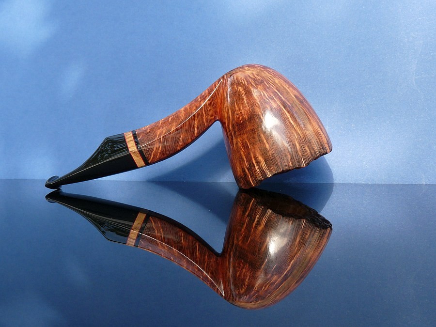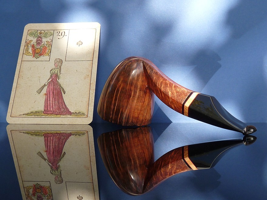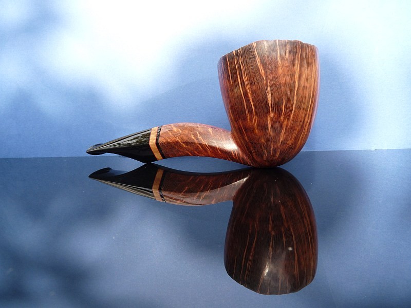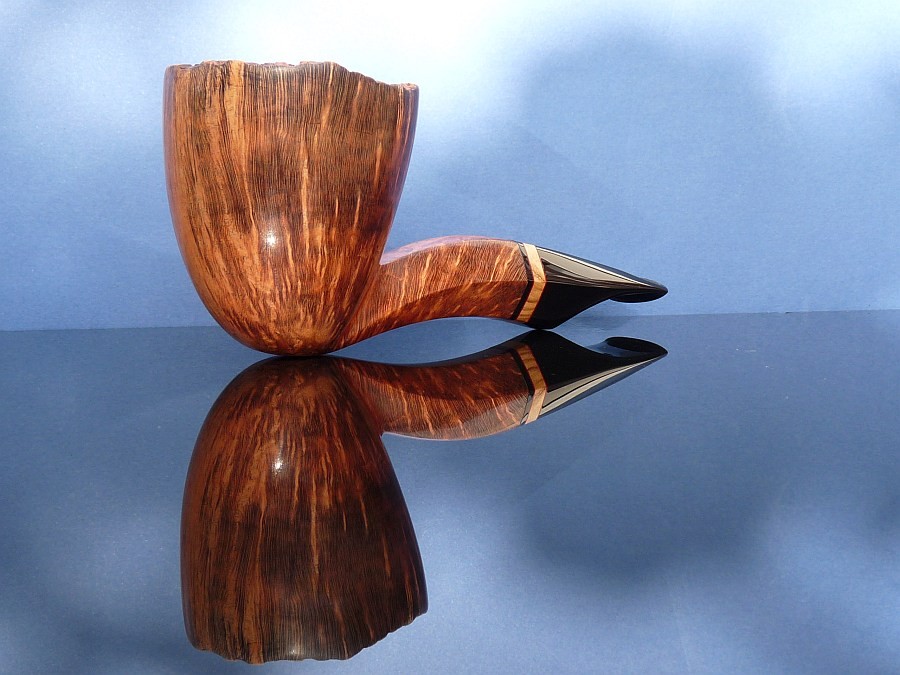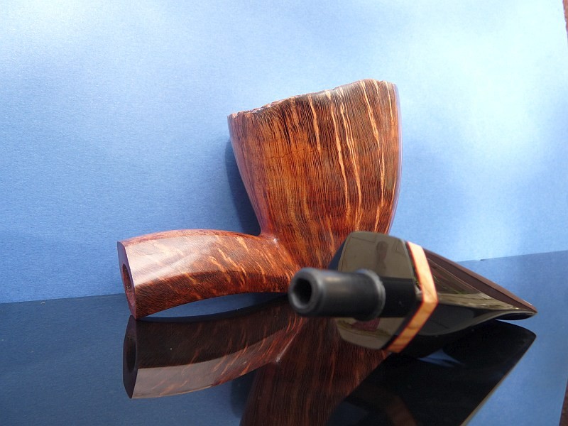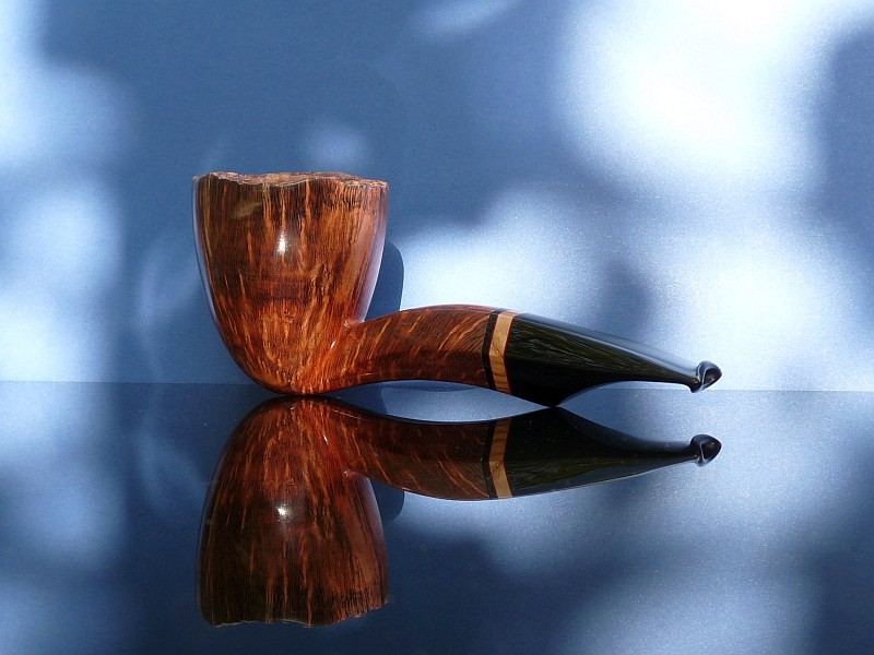 Freihand Tabak Pfeife – extra trockens Bruyère (Mimmo Romeo-Italien), Applikation-Olivenholz/Bloodwood,Mundstück handgeschnitten Lucite, Pfeifenreiniger geht glatt durch.Weit geöffnete Y Fächerung am Biss.Eine Pfeife die ausgewogen und fein balanziert angenehm in der Hand liegt,kommt mit schwarzem Plüsch Säckchen.